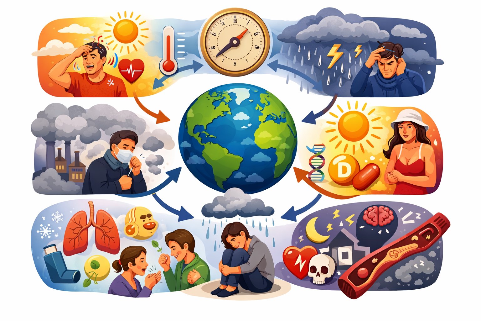 🧠Ջերմաստիճանի ծայրահեղ փոփոխությունները կարող են խաթարել ջերմակարգավորումը՝ բարձրացնելով ջերմահարվածի, հիպոթերմիայի և սրտանոթային բարդությունների ռիսկը։ Օդի խոնավության շեղումները բացասաբար են ազդում շնչառական համակարգի վրա՝ սրելով ալերգիկ և բրոնխոթոքային հիվանդությունները։