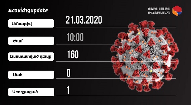 Մարտի 21-ի, ժամը 10:00-ի դրությամբ հաստատվել է կորոնավիրուսային հիվանդության 160 դեպք, որոնցից 1-ն` առողջացած: