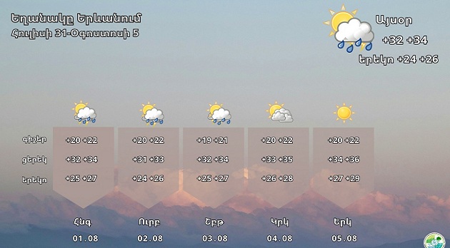 Read MoreԵՂԱՆԱԿԻ ԿԱՆԽԱՏԵՍՈՒՄՀՈՒԼԻՍԻ 31-ՕԳՈՍՏՈՍԻ 5 Երևանում հուլիսի 31-ի ցերեկը, օգոստոսի 1-3-ը երեկոյան ժամերին քաղաքի առանձին հատվածներում հնարավոր է կարճատև անձրև և