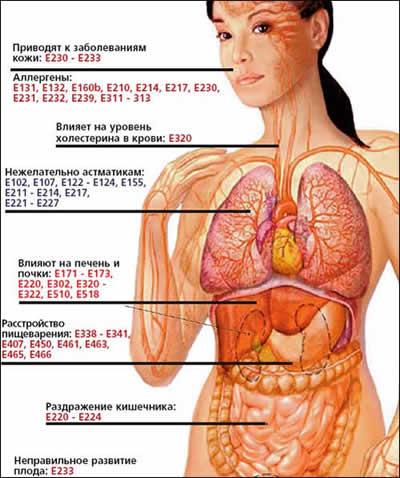 Իսկ նկարում կարող եք ծանոթանալ,թե E խմբի հավելումների կոնկրետ որ տարատեսակներն են ազդում յուրաքանչյուր օրգան-համակարգի վրա: